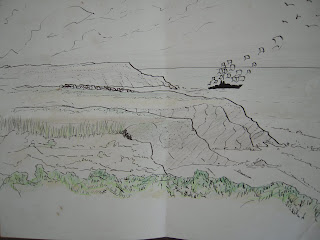 Desenho de 1997, com a Costa Azul (feita de memória) e um barco-silhueta de Évora, em direcção ao Atlântico...